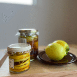 出来上がったレモン蜂蜜の瓶とレモンを眺めながら、